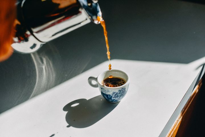 Close up of an espresso cup while a mocha pot is pouring coffee into it.