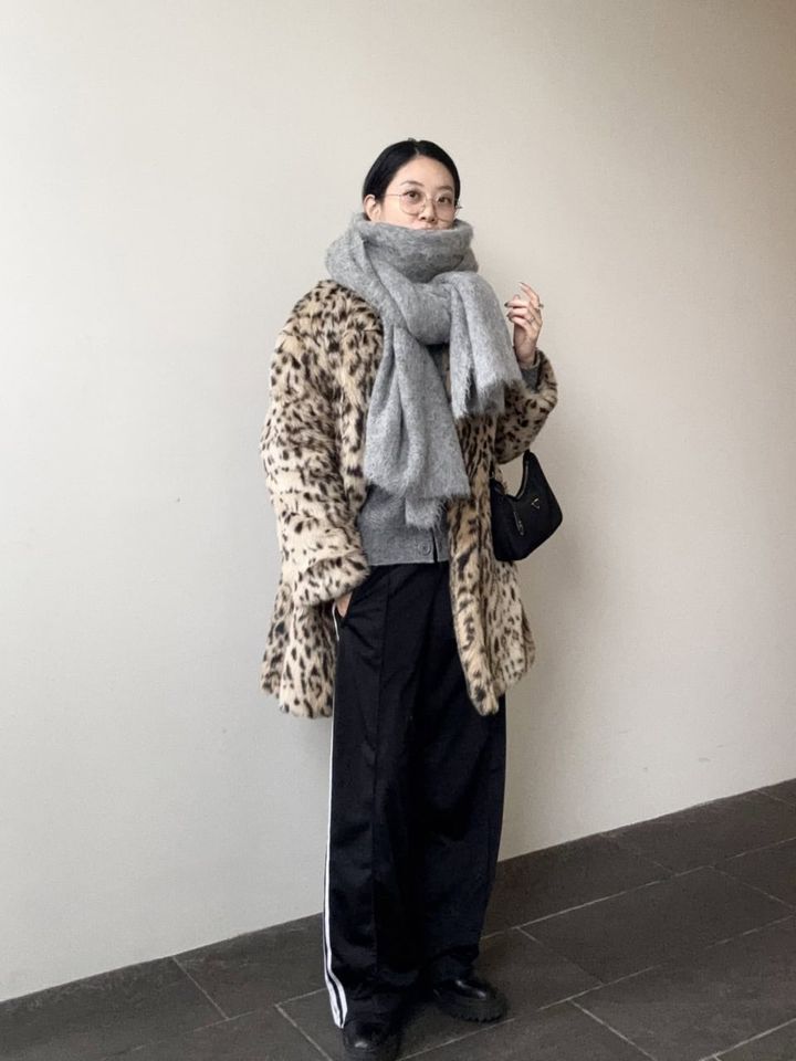 「トーのアルパカシャギー素材でボリュームのあるマフラーを2回ぐるっと巻いてポイントに。ベースはモノトーンコーデですがレオパード柄のファーコートを羽織って華やかさも意識しました。ファーコートがリッチになりすぎないよう、ラインパンツでカジュアルダウンしています」