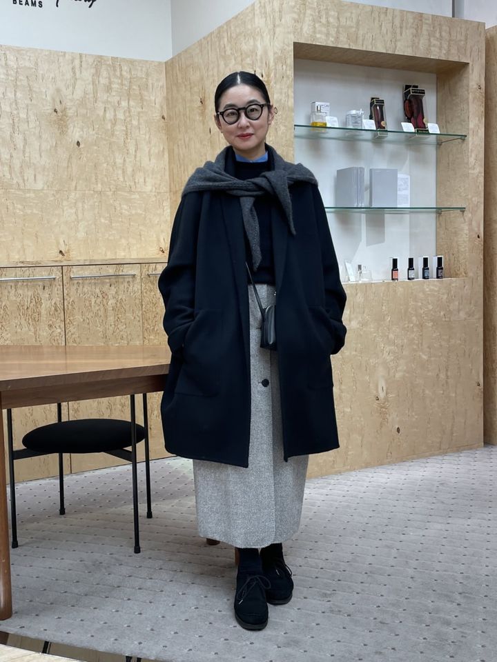 「タイムレスに愛用できる、上質で心地よい素材のアイテムたちには思い切って投資したい、そんなマインドで上質なアイテムを選んだコーディネートです。ザ・ロウのスカーフは、シンプルなスタイリングに巻くだけで季節感とモダンさを与えてくれるのでお気に入り。華やかさが出るよう、モノトーンのコーディネートにブルーのシャツでカラーアクセントをつけました」