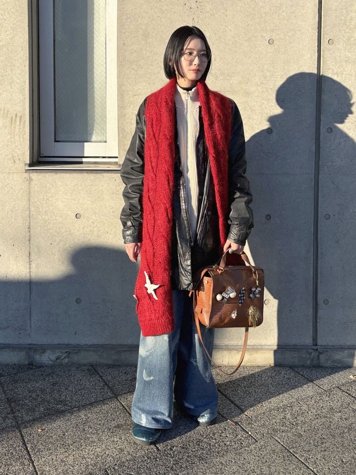 「ボリュームのある真っ赤なモヘアのマフラーを、巻かずにストールとして垂らしてコーディネートの差し色に。素材感のある小物でスタイリングに暖かみをプラスしています。味のあるヴィンテージのレザージャケットを一点投入し、こなれた印象のスタイリングに。SUBUのシューズは冬でも履けるサンダルで、ダウンのような暖かさが足元を包んでくれます」
