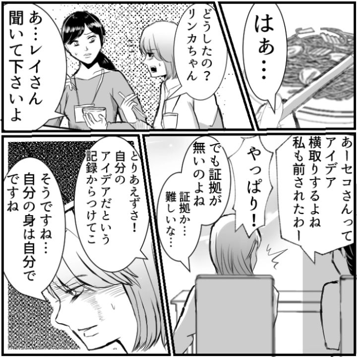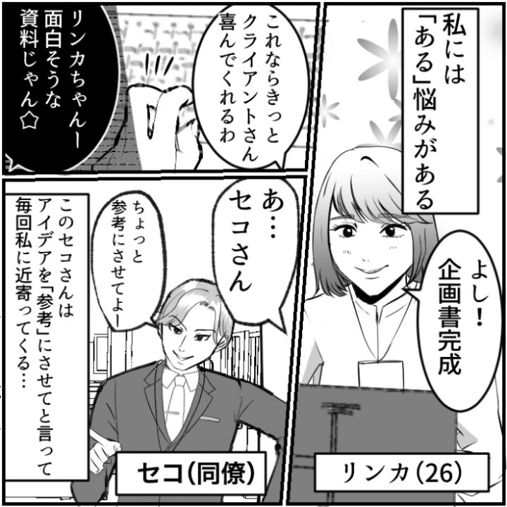 主人公のリンカは仕事で悩んでいることがあります。それは毎回〝参考にさせて〟と資料を見る先輩がアイディアを丸パクリすること。