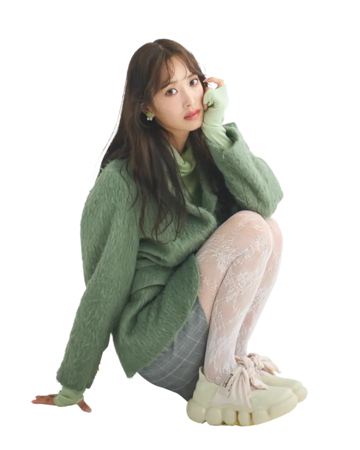 スニーカー 38,500円/grounds(アトモス ピンク フラッグシップ 原宿)グリーンコート 22,000円、グリーンシアータートルトップス 6,600円/ともにUngrid グレーチェックミニスカート 5,990円/MANGO イヤリング 4,620円/アビステ タイツ 979円/チュチュアンナ