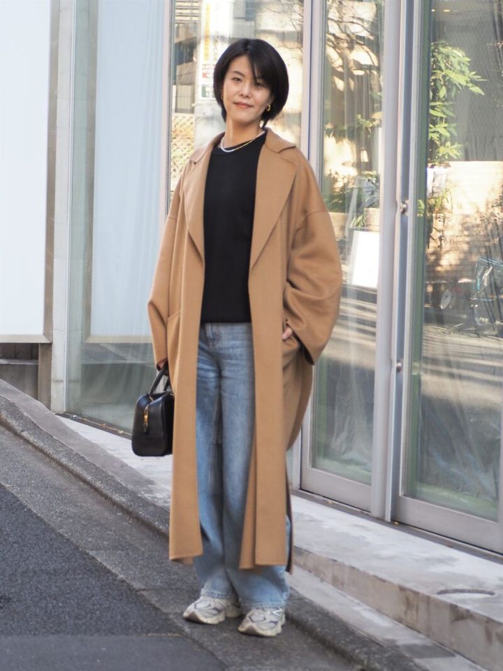 アウトレットで購入した「ロエベ」のキャメルコートは、長身のアイさんをすっぽり包み込むロング丈。落ち感のあるシルエットで、きれいめな着こなしに。「お気に入りの『カレンソロジー』のデニムなど、カジュアルなアイテムとの相性も抜群。かなり重宝しています」