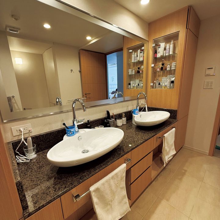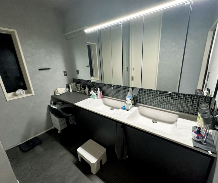 洗面台で洗顔後すぐスキンケアやメイクができ、汚れた手もさっと洗えて、ヘアセットもすべてこの空間で完結するからとっても楽ちん。