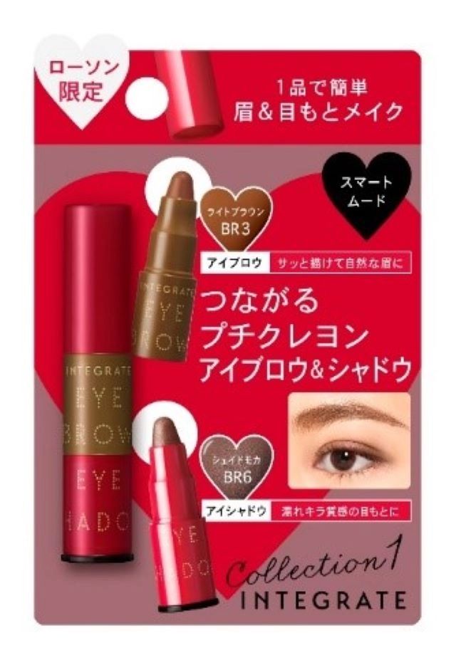 ローソン限定のインテグレート「プチクレヨンアイブロウ&シャドウ ミニセット」は、携帯に便利なクレヨンタイプの1本で、アイブロウとアイシャドウのセットになっています。眉はサッと描けて自然な仕上がりに。目元は濡れたようなキラキラ質感に仕上がります。フィット感もあり美しい眉&目元が持続します。