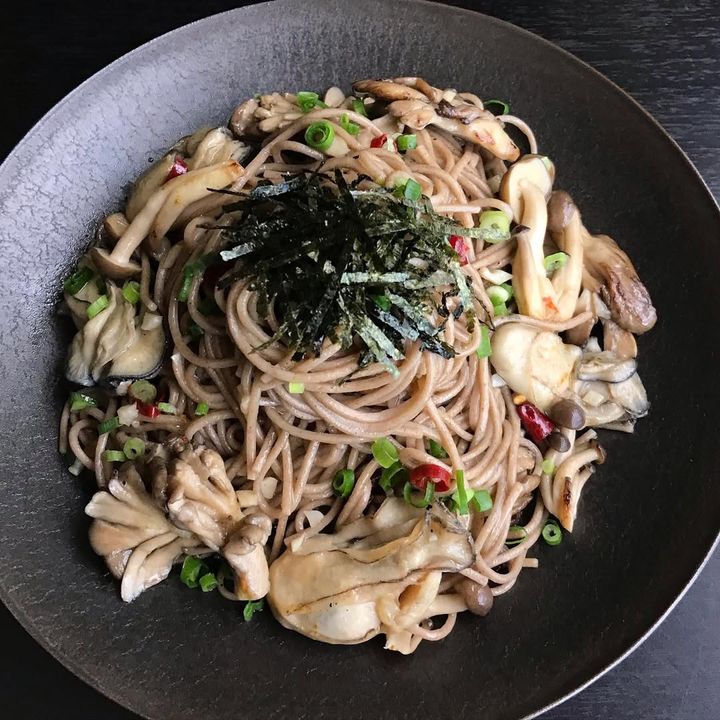 こちらの「蕎麦の和風ペペロンチーノ」は、牡蠣ときのこ入りで旨味たっぷり。香りづけに日本酒を使っているのもポイントです。