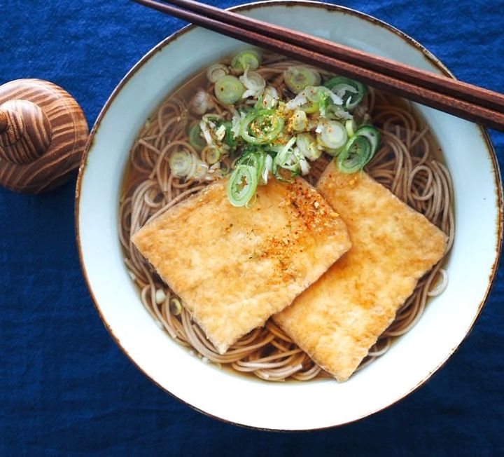 どんぶりに茹でた蕎麦(必要であれば水洗いした後に湯通し)してどんぶりに移し、そこに出汁つゆを注ぎ、お揚げ、刻んだネギを乗せたら完成。Instagram(@mizuame7)