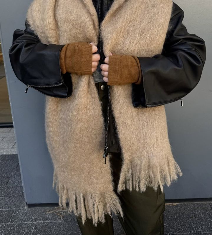 「ふんわりとしたキャメル色のモヘアストールは、マンタスエスカライの1930年から続くスペインの老舗ファクトリーブランドのもの。このストールと同じくキャメルのフィンガーレスグローブをポイントに。素材と色の掛け合いを楽しむコーディネートにしました。モヘアとレザーはとても好相性で、素材と素材のコントラストがスタイリングに映える! モヘアの毛もレザーならつきにくいので快適です」