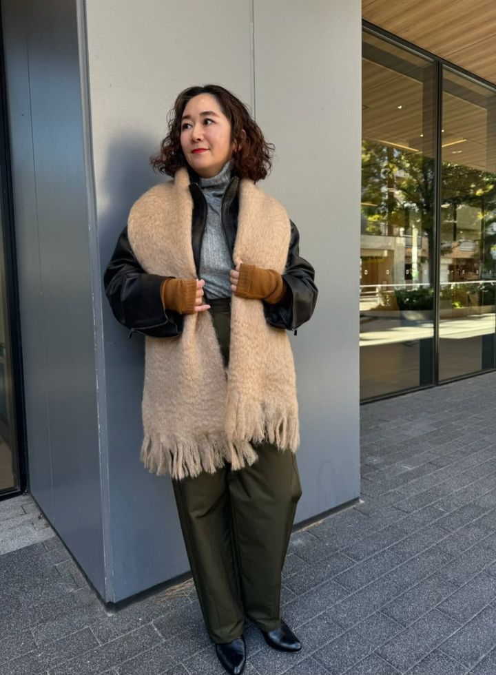 毛がつきにくい快適さも!ストールとレザーのコントラストが最高【365日スナップ】志波かよこさん