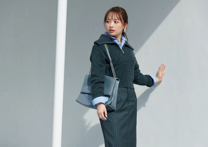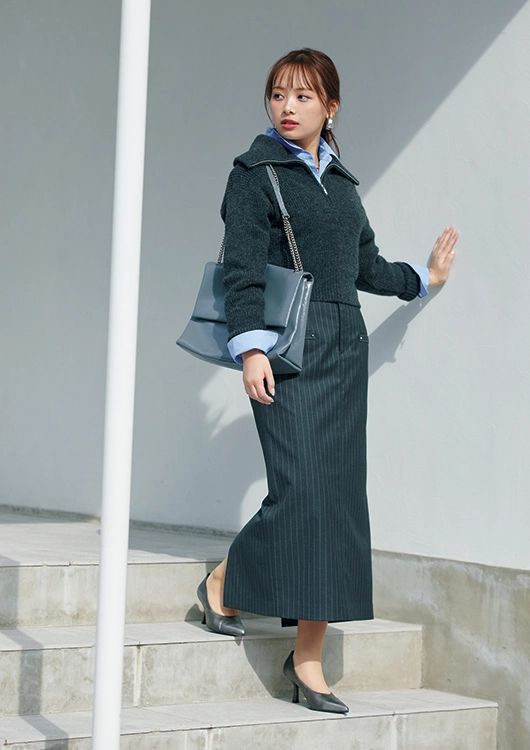 グレービッグカラーハーフジップニット¥2,990/GU 水色シャツ¥9,240/ミラ オーウェン ルミネ新宿2店 サスペンダー付きストライプタイトスカート¥18,700/アプワイザー・リッシェ チョーカー¥7,150、バングル¥6,050/ともにロニ ピアス¥14,300/LOHME バッグ¥13,900、パンプス¥9,900/ともにCHARLES&KEITH JAPAN