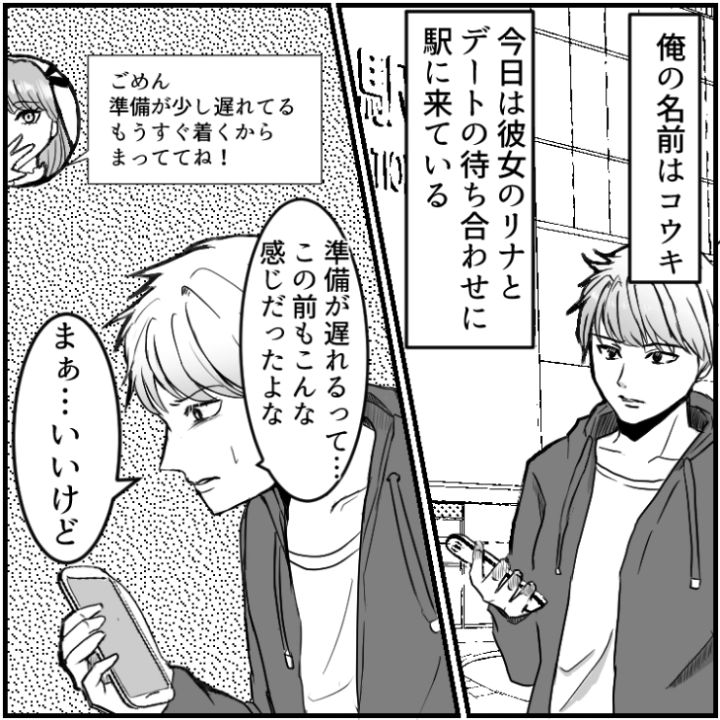 彼女のリナと待ち合わせをしている主人公のコウキ。デートには頻繁に遅刻するリナ。その理由が困ったもので・・・。
