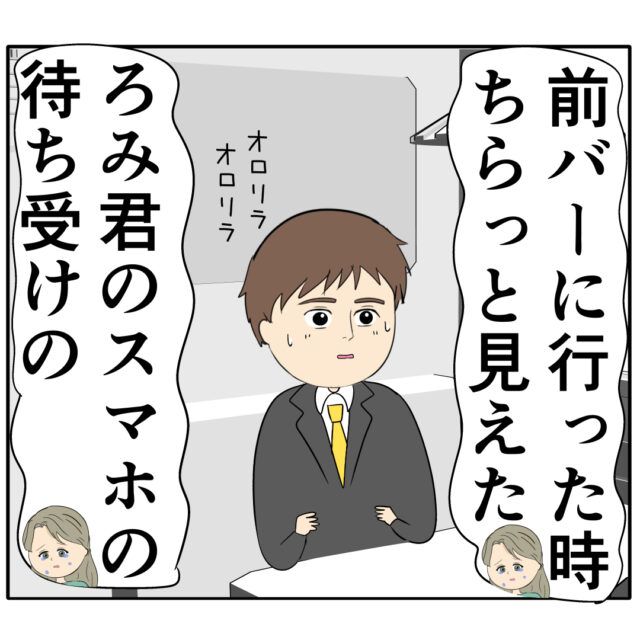 ろみ緒さんはジュリ実さんの涙におろおろ。ジュリ実さんは、めいさんと知り合いになった経緯を泣きながら話します。「前バーに行った時ちらっと見えたろみ君のスマホの待ち受けの」