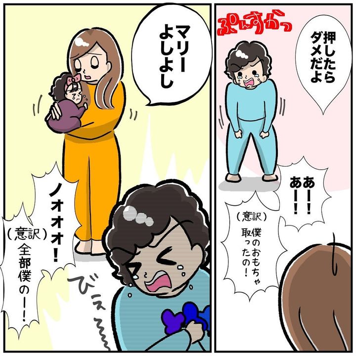 ジョセフくんが遊んでいたミニカーを、マリーちゃんが取ってしまったことに怒り、ジョセフくんはマリーちゃんを手で押し、叱られたジョセフくんは泣いてしまいます。一方、マリーちゃんはちゃっかりとミニカーを隠し持っていたのでした。