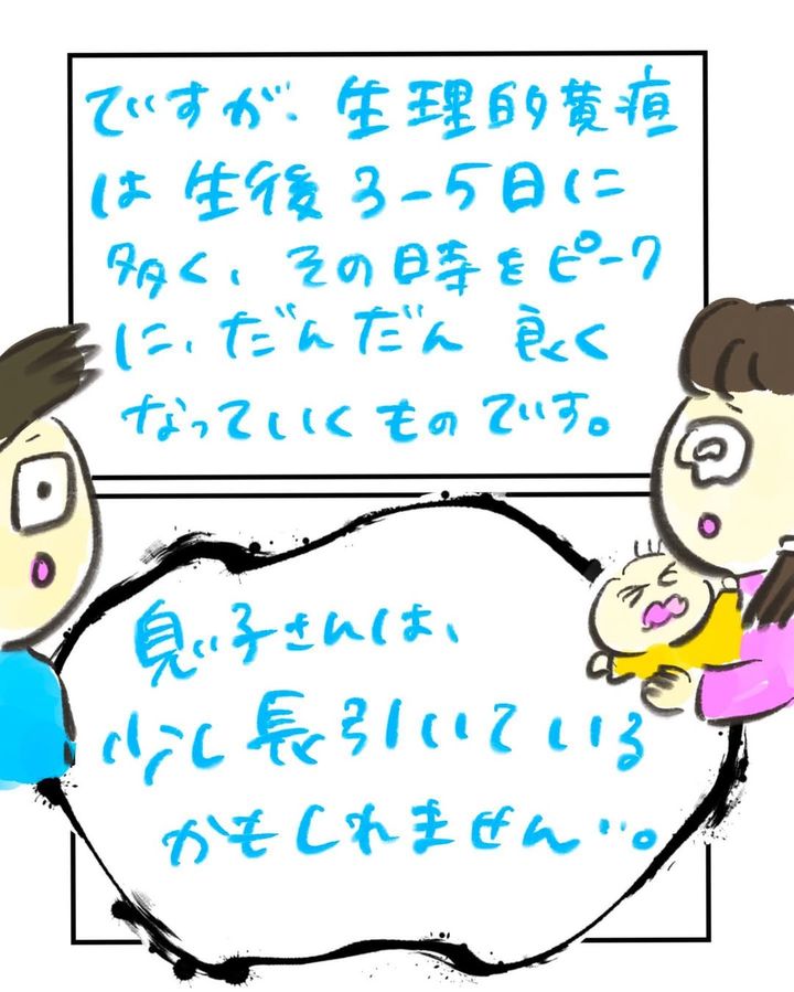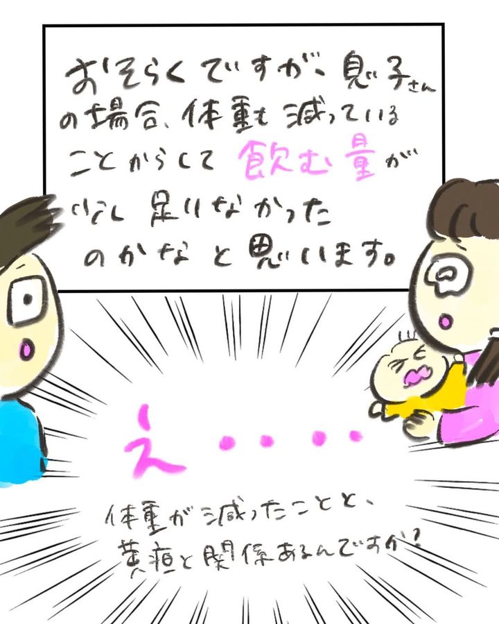 誕生後、なかなかうまく母乳を飲むことができず、体重が激減していたおたんこ助産師さんのお子さん。さらに黄疸も出ており、入院して治療を受けることになり…?