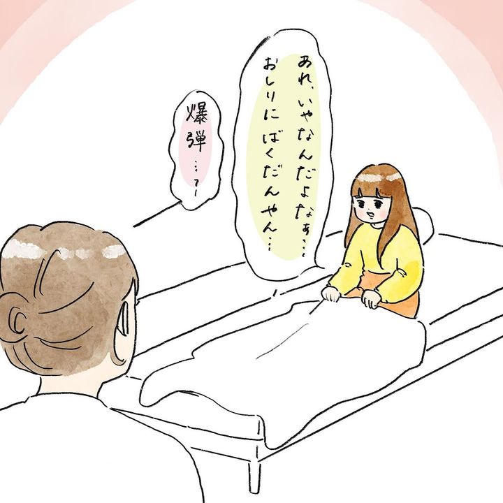 娘さんが本気で座薬を拒否する気持ちが伝わってきます。それにしても、「おしりにばくだん」という表現がユニーク過ぎて、笑いを誘いますよね。