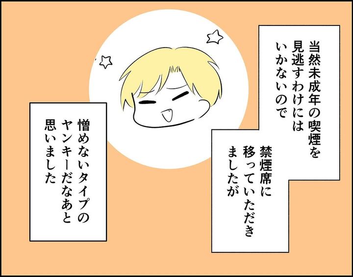 飲食店でのアルバイト中、未成年に見える客が喫煙席にいたそう。後輩スタッフが年齢確認すると、「今年ハタチ!」と正直に答え、まいかわセミさんは、「憎めないタイプのヤンキーだなあ」と思うのでした。