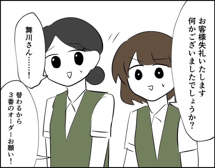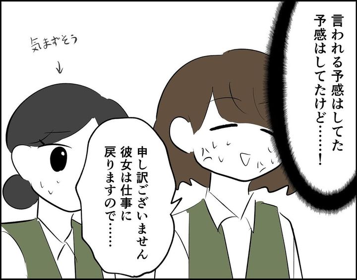 怒りに震えながらも、グッと堪え、「申し訳ございません 彼女は仕事に戻りますので……」と平静を装うまいかわセミさん、立派です。カスタマーハラスメントに屈しない姿勢に感心しました!