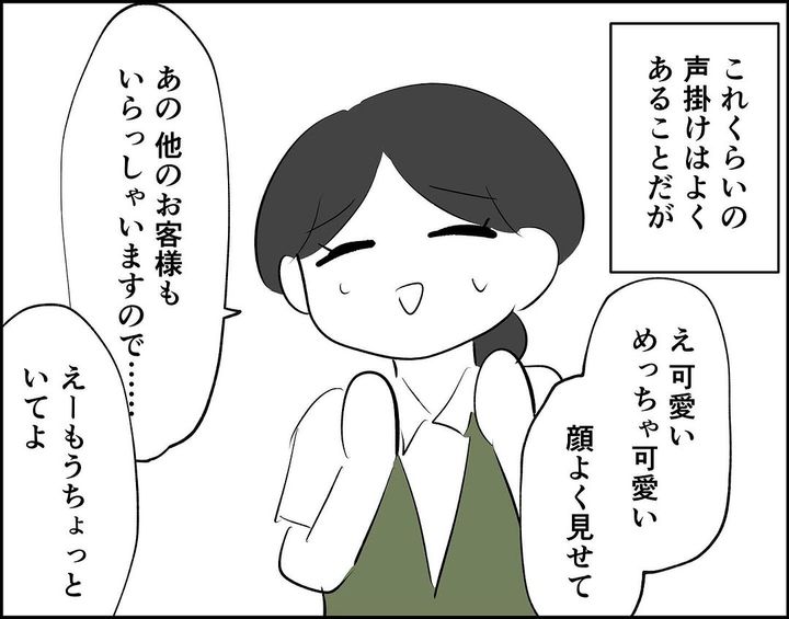 飲食店でのアルバイト中、可愛い後輩スタッフが客に絡まれていたため、「お客様失礼いたします 何かございましたでしょうか?」と助け舟を出すまいかわセミさん。しかし、客から、「お前には用ねえよブス」と、暴言を浴びせられてしまうのでした。