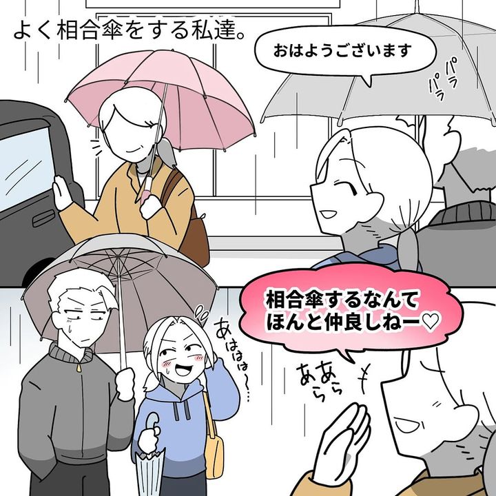 2. 「相合傘なんて仲良しね♡」と声掛けられる夫婦→実は裏側で、“激しい攻防戦”が繰り広げられていた