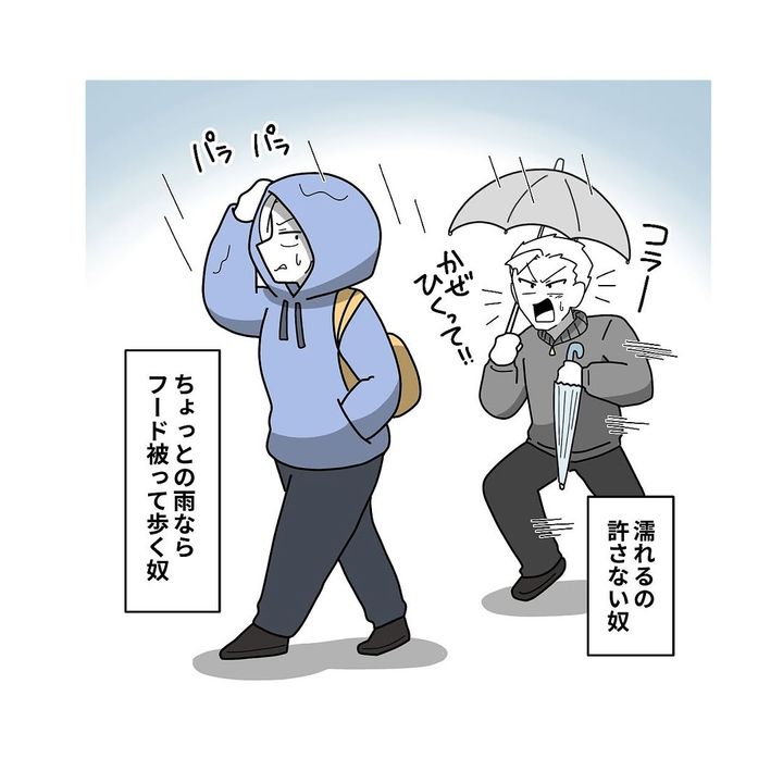 やまみーさん夫妻はよく相合傘をするそうで、「相合傘するなんてほんと仲良しねー」と声を掛けられます。しかし、実際は、雨に濡れるのを許さない夫と、少しの雨ならフードを被って歩くやまみーさんとの間で、激しい攻防が繰り広げられているのでした。