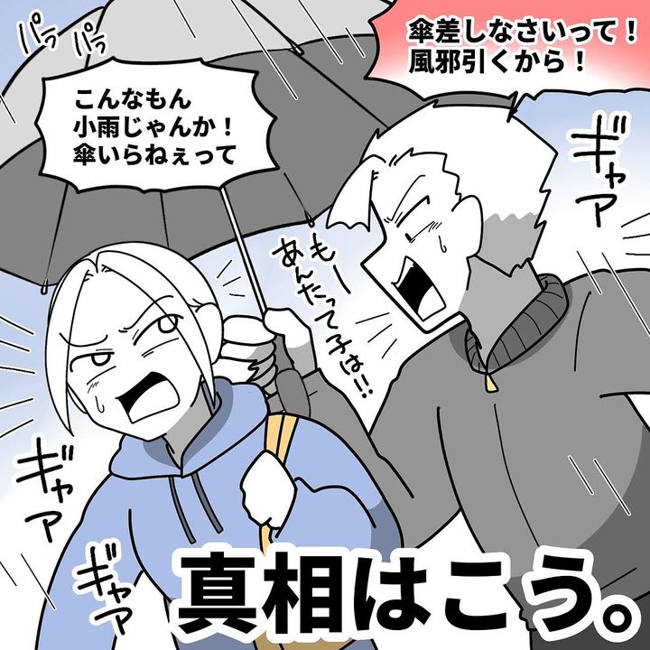 「傘差しなさいって!風邪引くから!」「こんなもん小雨じゃんか!傘いらねぇって」と、激しく言い合う2人の姿が面白く、思わず吹き出してしまいました!喧嘩するほど仲がいい、ということなのでしょう!
