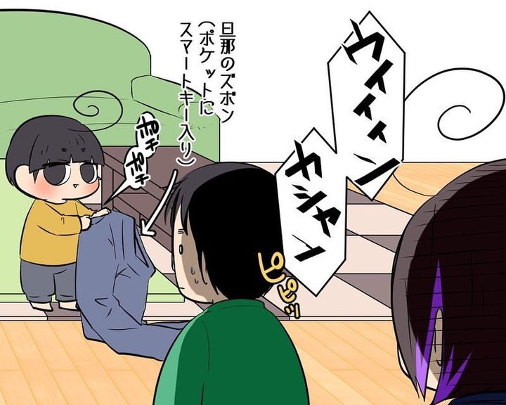玄関のスマートロックが、突然、開錠と施錠を繰り返し始め、「ホラーやん」とさいとうさん。おうちゃんが夫のズボンのポケットに入ったスマートキーを押していたのが原因だったのでした。