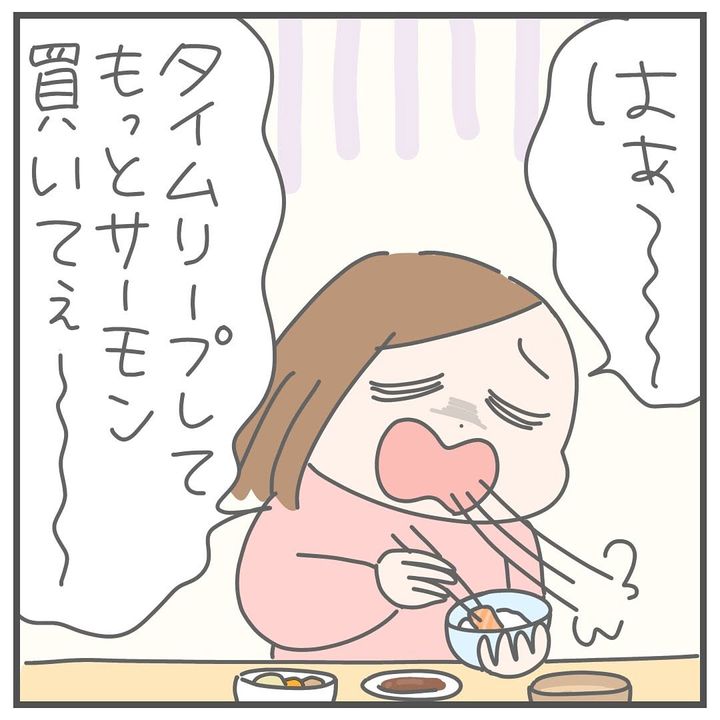 タイムリープを使ってまで、もっとサーモンを買っておけばよかったと後悔するのですから、よほどサーモンがおいしかったのでしょうね。夫の的確なツッコミが光ります。