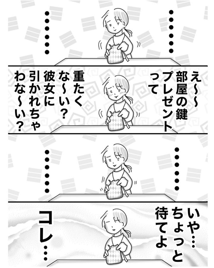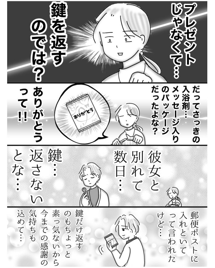 男性の客に、入浴剤と部屋の鍵をラッピングしてほしいと頼まれたオムニウッチーさん。プレゼントではなく、別れた彼女に鍵を返すのだろうと推察し、一人で涙ぐむのでした。