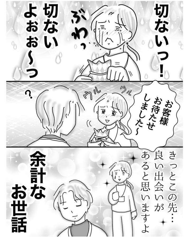 想像を膨らませて、男性客の「彼女との別れ」に涙するオムニウッチーさんの姿がとてもユニークです。「きっとこの先…良い出会いがあると思いますよ」というセリフも笑いを誘います。