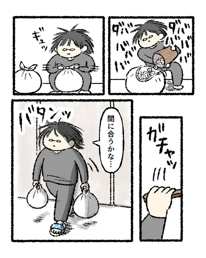 朝、着の身着のままゴミを捨てに行きますが…?