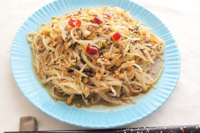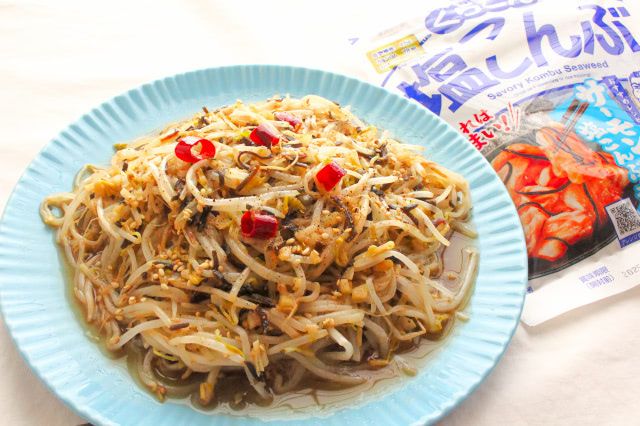 塩昆布を加えたので、少し茶色っぽい、もやし炒めのような仕上がりに。パスタのペペロンチーノそのもののような、食欲をそそる香りが広がっています♪