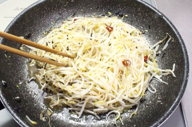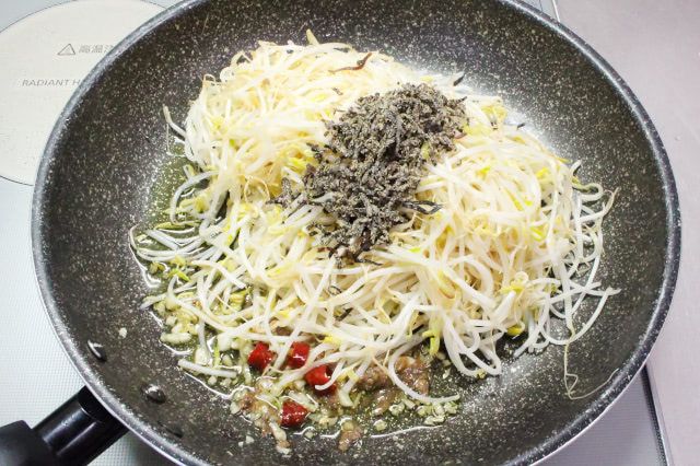 5.湯切りしたもやしと塩昆布を加え、中火に点火します。もやしの水分を飛ばすように炒め、黒こしょうを加えます。