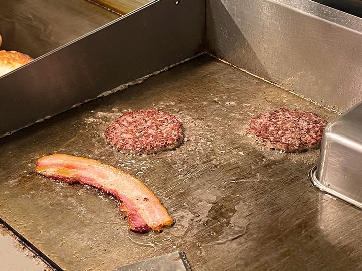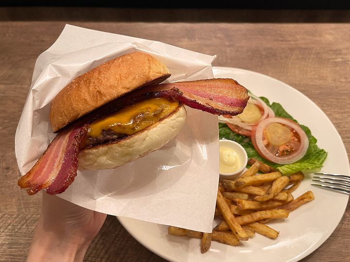 こちらも人気だという「ベーコンチーズバーガー」は、バンズからはみ出す大きなベーコンに思わず目を奪われます。