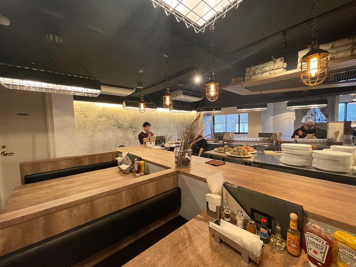 店内は、オープンキッチンを囲むようにボックス席やカウンター席が用意されており、広々とした空間が広がります。