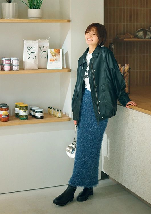 ニットスカート¥19,800/FRAY I.D ルミネ新宿2店 ブルゾン¥31,900、Tシャツ¥9,680/ともにStola. イヤリング¥3,200/ルナシック(ロードス) バッグ¥16,900/O 0 u(アドアーリンク) ブーツ¥29,700/ダイアナ(ダイアナ 銀座本店)