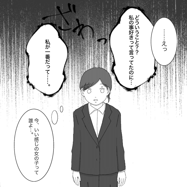 「・・・えっ。どういうこと??私のこと『好き』って言ってたのに・・」「私が一番だって・・」「今いい感じの子って誰よ・・」ミカの頭の中は混乱していました。