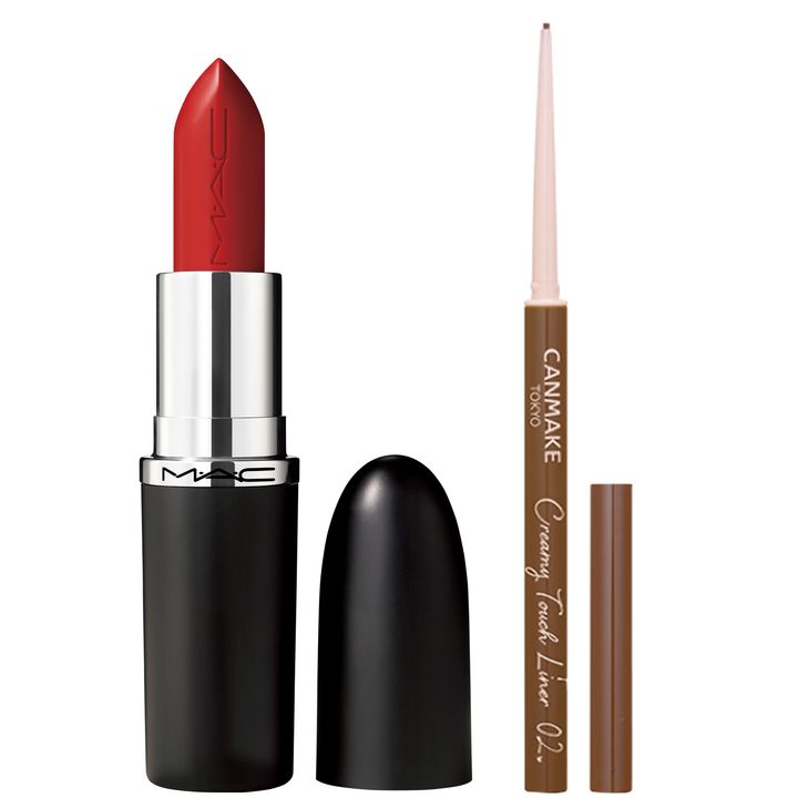 【ばあばにPresent!】(左)マキシマル スリーク サテン リップスティック センター オブ アテンション ¥4,620(M・A・C)(右)キャンメイク クリーミータッチライナー 03 ¥715(井田ラボラトリーズ)