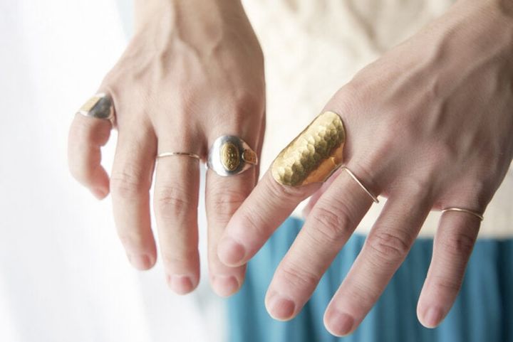 飲食店で食品を扱うので、ネイルはつけていない。その分、真鍮のリングや、スプーンを曲げたリングなど、個性的なリングをアクセントに指先のおしゃれを楽しみます。「リングはeat YOGAstudioでも取り扱いしています」