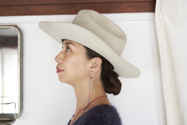 行きつけの古着屋で見つけたフェルト帽は、ツバが広めでフェミニンな装いにも、マニッシュな着こなしにも似合う。「帽子は好きなアイテムでよくかぶります」と神谷さん。少しサイズが大きめなので、内側に詰め物をしてジャストサイズに調整したそう。