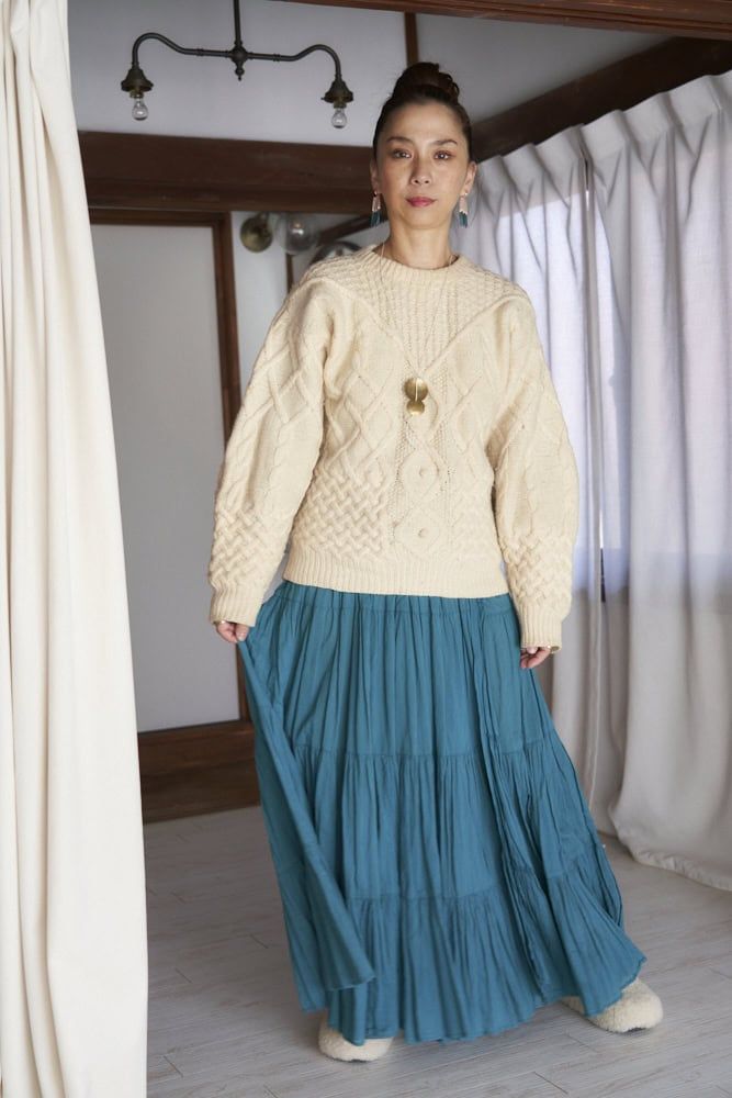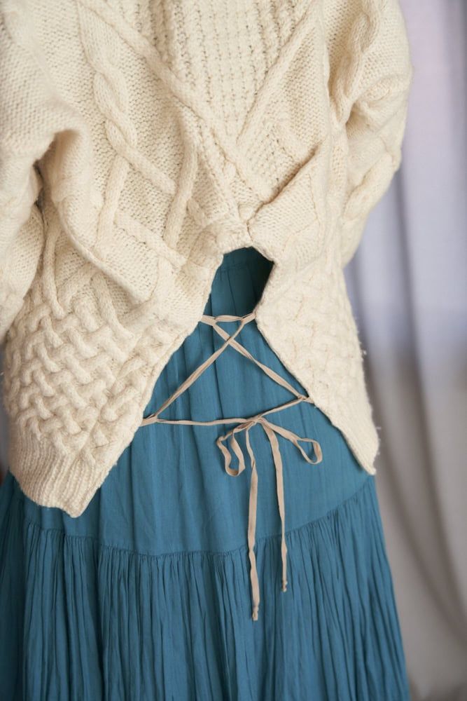 古着をリメイクしたビスチェタイプのセーターは、10年以上前に購入して毎シーズン着るお気に入り。ボトムスにはカシュクールのワンピースを合わせて、「ラクちんだけどスタイルがよく見えるように。ワンピースは同じものをグリーン、パープル、ブラックと3色、色違いで持っています」と神谷さん。後ろについたリボンをキュッと締めると、後ろ姿も美しく全体のシルエットがすっきりと見えます。