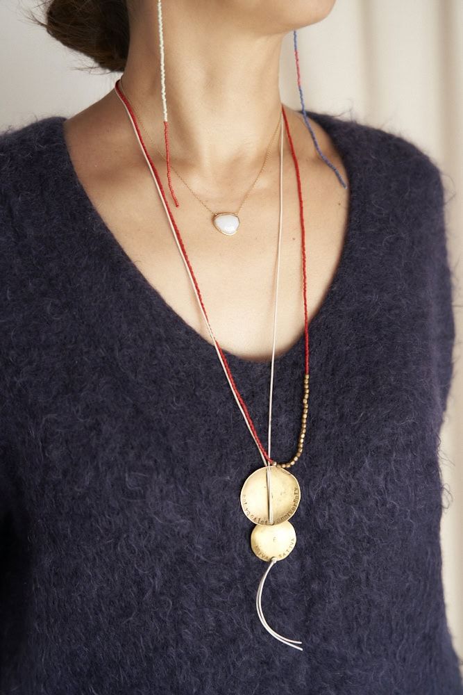 ホワイトオパールのペンダントを起点に、赤のコードネックレスと大ぶりな真鍮のペンダントを重ねてつけました。「真鍮のペンダントは、うちの店の1周年記念のノベルティグッズ。いまも愛用しています」