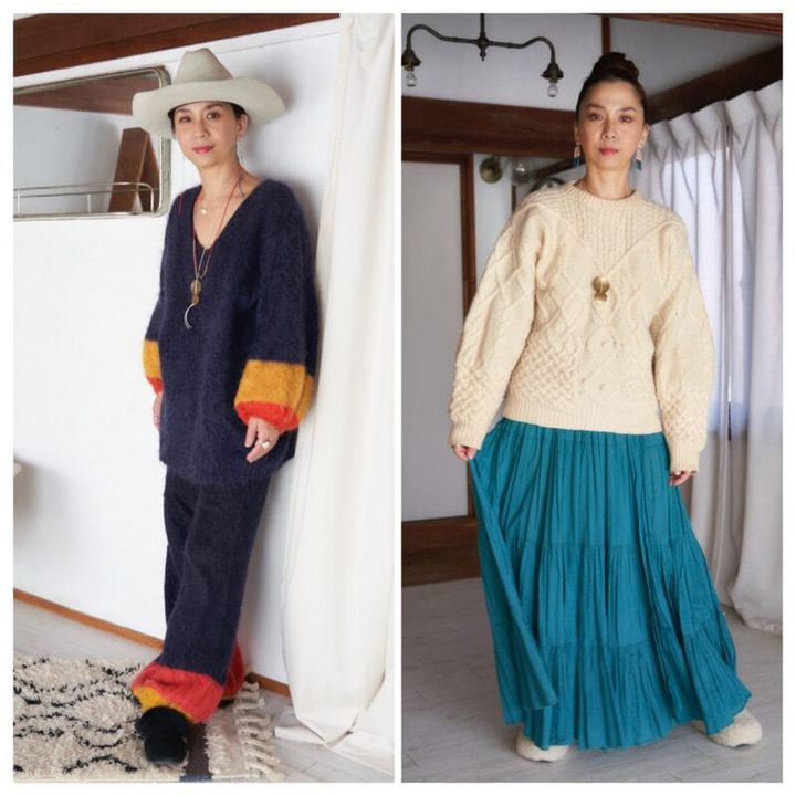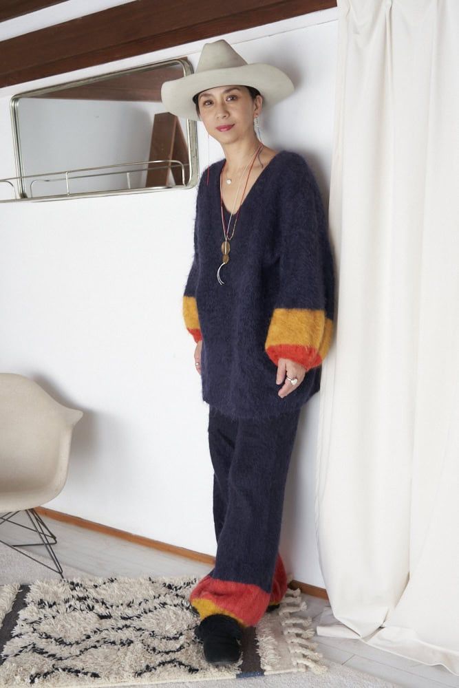 ネイビー、イエロー、ホワイト、レッドを色違いでそろえ、ヘビロテするほどお気に入りのモヘアセーターは、カラフルなラインカラーとボリューム袖がポイント。「上下を別々に買ったパンツとセットアップ風に着ると、シルエットがすっきりします。袖のドレープとVネックの開きが女性らしい雰囲気で気に入っています。このセーターを着ていると、友だちやお客さまから『それ、どこの?』と聞かれることが多くて」と神谷さん。上質なフェルトのハットをかぶって、70年代風の雰囲気をプラスしました。