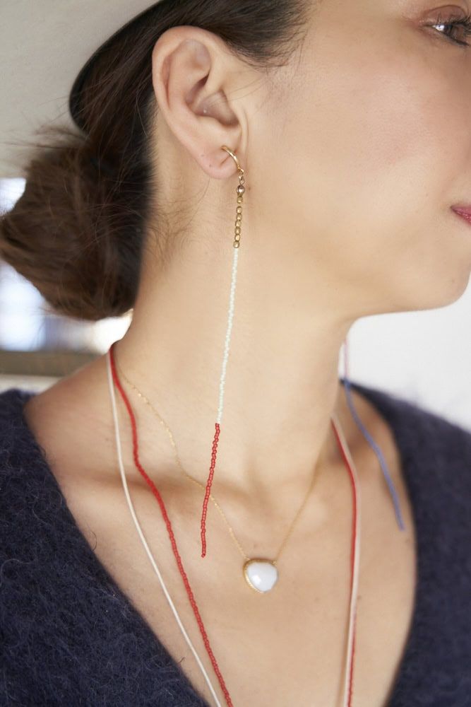 かつてはピアスを愛用していたところ、金属アレルギーを発症。「いまはピアスをイヤリングに替えてもらって、耳元のおしゃれを楽しんでいます」。一本の長いビーズイヤリングは、首元で揺れておしゃれ感がアップします。