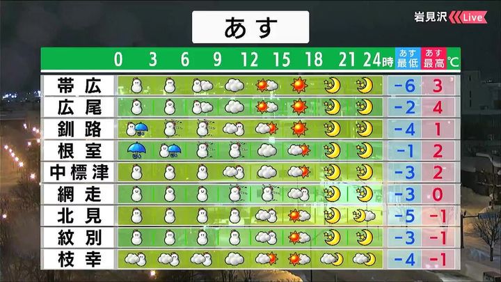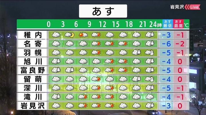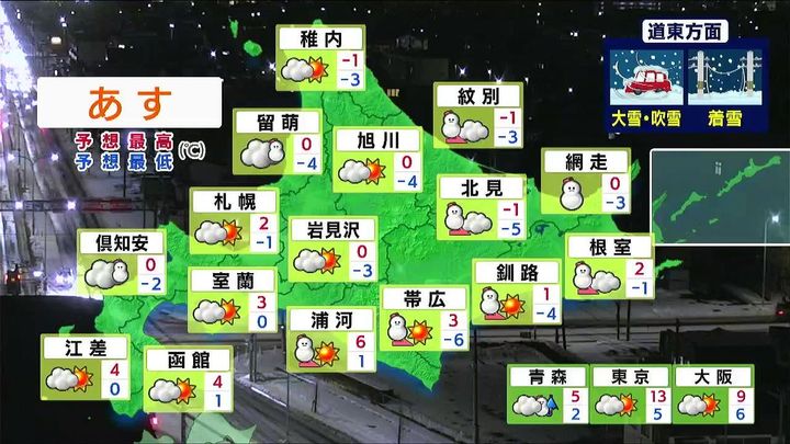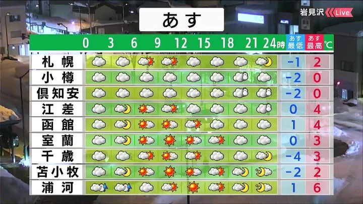 朝晩は後志地方や浦河周辺で雪が降りますが、日中は札幌や函館、苫小牧など広く日ざしが出ます。気温はほぼ横ばいで、変化が小さいでしょう。