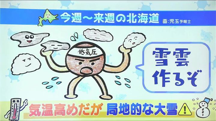 今週から来週にかけて、北海道付近には次々に低気圧がやってきます。きょう6日も低気圧の影響で雪や雨が降りました。低気圧は「雪雲作るぞ!」と汗をかきながら熱くなっています。その影響で空気が暖められ、極端な寒さにはなりません。