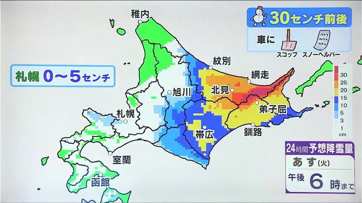 これからは道東方面で大雪です。あす7日の午後6時までの24時間に降る雪の量は、知床半島周辺や小清水町、弟子屈町、津別町周辺で30センチ前後、網走、紋別、北見、釧路、帯広周辺でも20センチ前後のまとまった雪になりそうです。湿った雪でタイヤがはまるおそれもあるので、車にスコップなどを積んでおきましょう。