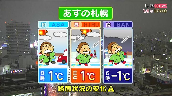 道東方面は大雪だけでなく、吹雪や電線などへの着雪にも注意して下さい。その他は広く日ざしが出ますが、ツルツル・ザクザクと路面状況が変わりやすくなりそうです。