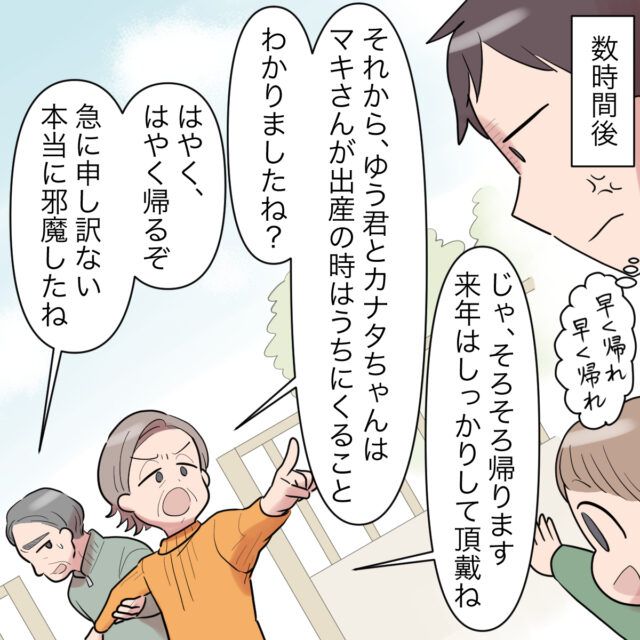 そして数時間後のこと。「じゃ、そろそろ帰ります。来年はしっかりして頂戴ね」「それから、ゆうくんとカナタちゃんは、マキさんが出産の時はうちにくること!わかりましたね?」と言いたい放題の義母。「はやく帰るぞ」と義母に声を掛けつつ、「急に申し訳ない。本当に邪魔したね」申し訳なさそうに義父が言いました。