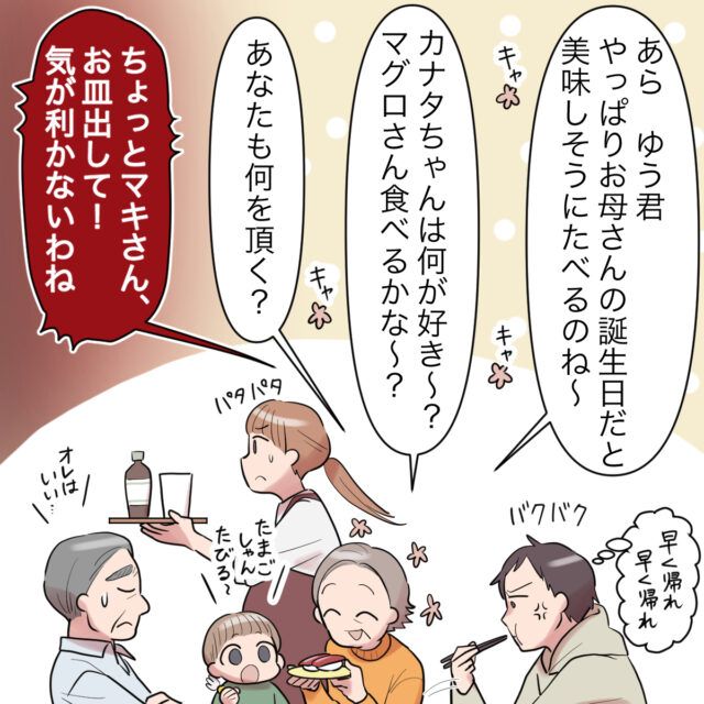 そして、早く帰ってもらいたい一心で始まった義母のお誕生日会。「早く帰れ早く帰れ」と願いながら急いで食べるゆうさんを見て、「あらゆうくん、やっぱりお母さんの誕生日だと美味しそうに食べるのね~」と言う義母、さらに「カナタちゃんは何が好き~?マグロさん食べるかな~?」「お父さんは何をいただく?」と言いながら、「ちょっとマキさん、お皿出して!もう気が利かないわね」とマキさんにはやっぱり冷たい口調なのでした。