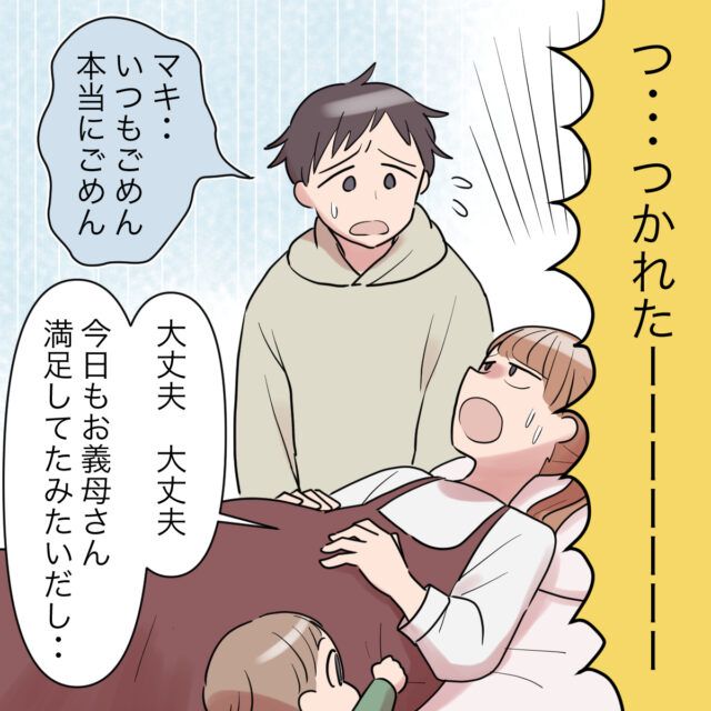 義父母がやっと帰った後のこと。「つ・・つかれたーーーーー」お腹が張って横になるマキさんに、「マキ・・いつもごめん。本当にごめん」と謝るゆうさん。「大丈夫。大丈夫。今日もお義母さん満足してたみたいだし・・」マキさんが言いました。